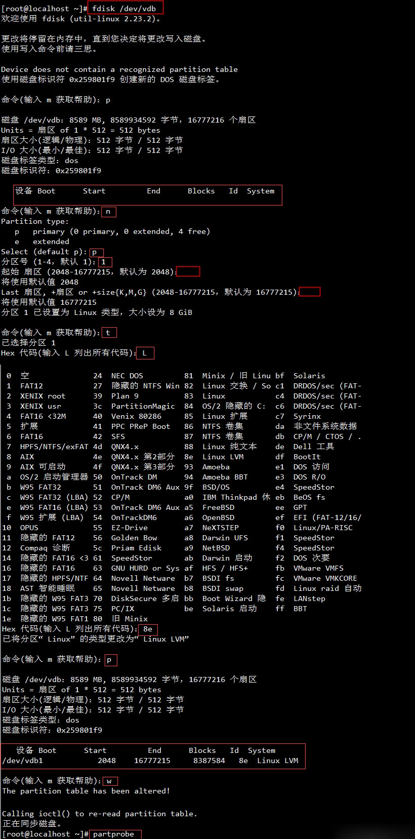 使用 fdisk 命令对新盘进行分区,这里建立了一个主分区 /dev/vdb1,大小8GB,最后使用 partprobe 命令重新读取分区表: